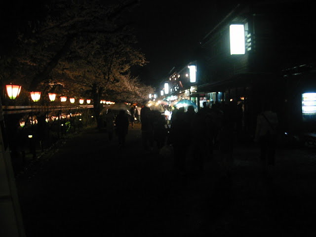 It started pouring with rain, but we were entranced by the lanterns and the cherry blossoms. Apparently, the park was open for a hanami-matsuri, cherry blossom festival. There was a line of combined souvenir shops/restaurants, and we welcomed the chance to get out of the freezing rain.