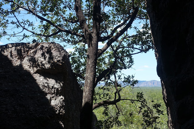 The mango farms merge into the Adelaide River wetlands, the roadbed raised above the wet season floods. Lagoons of lilies and long reeds in which saltwater crocodiles probably lurk. Then it is back to savannah country. The country feels both dry and wet at the same time. Sometimes there are clumps of pandanus and paperbark, other times spear grass and woody trees. Boulders and termite mounds can be spotted. The road glitters in the sun, I guess from embedded polished quartz stones.